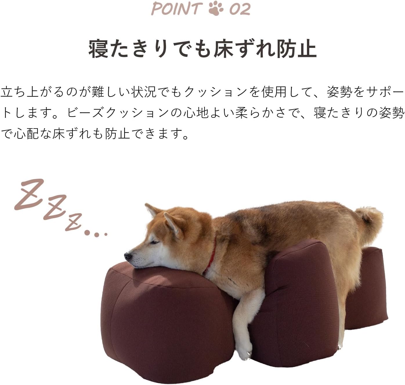 リラクッションの最大の特徴は、その多機能性にあります。立ち姿勢での食事をサポートすることで、誤嚥を防止し、ペットの食事時間をより安全で快適なものに変えます。側面のサイドクッションは、ペットが横にずれるのを防ぎ、安定した姿勢を維持するのに役立ちます。さらに、広々とした頭部クッションは、ペットの頭部に追加のサポートを提供し、リラックスした状態で休息できるよう設計されています。ビーズクッションの特性により、床からの滑り落ちを心配する必要もありません。ペットがどのような姿勢をとっても、クッションが体の形に合わせて適応し、常に最適なサポートを提供します。また、表面素材は汚れに強く、お手入れも簡単です。日常的な汚れは、湿った布で優しく拭くだけで簡単に落とせます。ペットの健康をサポートしながらも、飼い主様の手間を最小限に抑える、思いやりのあるデザインがリラクッションの魅力です。