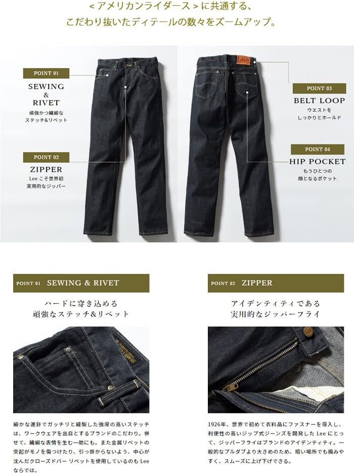 Lee AMERICAN RIDERS 202の魅力は、その細部へのこだわりにあります。逆ベル型のヒップポケットには、ブランドアイコンである「Lazy S Stitch(レイジーSステッチ)」が施され、レザーパッチと共に品質の証となっています。ポケット開口部の両端にはX字型の補強ステッチ「スレッドリベット」が採用されています。これは金属リベットの代わりとなる工夫で、サドルや椅子への損傷を防ぐ実用的なデザインです。フロントポケットには、使用されている綿の原産国を特定するトレーサビリティラベルが付いており、紡績、染色、織り、縫製を含むすべての工程の製造元が明記されています。この生産背景の開示は、同時に品質への自信の表れでもあります。日本製にこだわり抜いた本格派デニムは、穿き心地の良さと耐久性を両立させています。職人の手によって丁寧に仕上げられた縫製は、長年にわたって愛用できる品質を保証します。このデニムパンツは単なるファッションアイテムではなく、アメリカンカジュアルの歴史と日本のものづくりの精神が融合した芸術品なのです。