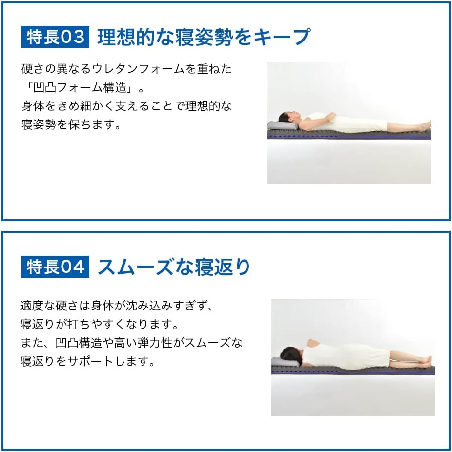 ムアツマットレスの最大の特徴は、独自の凸凹構造による体圧分散効果です。各凸部の間隔を絶妙に設計することで、最大沈み込み率約25mm(約1.0インチ)を実現。これにより、体が理想的な寝姿勢を保ちやすく、寝返りもスムーズになります。凸部の先端には卵型フォームが採用されており、この連続的な卵型構造が体圧をバランスよく水平・放射状に分散させます。寝ている間も体が安定し、快適な状態を維持できるのです。この構造は血行を妨げないよう接触面積を減らし、睡眠中の体への負担を軽減します。バランスの取れた体圧分散により、安定感のある心地よい眠りをサポート。また、異なる硬さのウレタンフォームを重ねた「凸凹フォーム構造」が、ちょうど良いサポート力で理想的な寝姿勢を実現します。適度な硬さで体が沈み込みすぎず、凸凹構造が寝返りもスムーズにサポートするため、朝までぐっすり眠れます。西川の長年の研究から生まれた理論に基づいた構造が、質の高い睡眠を可能にします。
