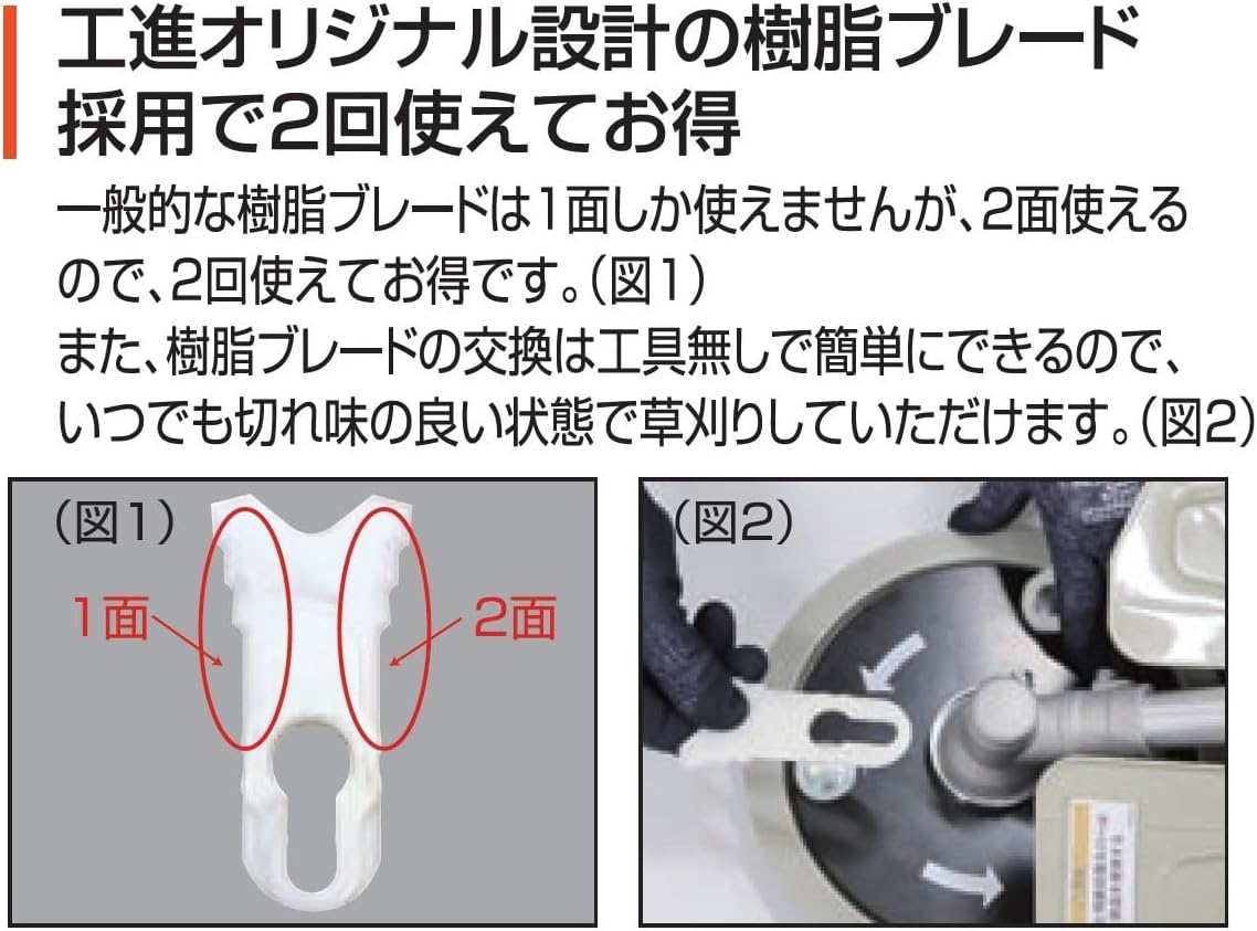 工進EFR-26C草刈機は、長期間の使用に耐える耐久性と、経済的なメンテナンス性を両立した優れた設計が特徴です。本体の主要部分にはポリプロピレン、アルミニウム、ポリエチレン、真鍮などの高品質な素材を使用しており、屋外での使用に耐える堅牢性を確保しています。特に重要な部品であるエンジン部分は、工進の長年のノウハウが詰まった信頼性の高い設計となっており、適切なメンテナンスを行うことで長期間安定した性能を維持できます。また、メンテナンス性にも優れており、付属のプラグレンチや六角レンチを使用することで、基本的なメンテナンスを自分で行うことが可能です。これにより、メンテナンスコストを抑えることができ、経済的に長く使い続けることができます。樹脂ブレードは消耗品ですが、付属の6枚のブレードに加え、交換用ブレードも手頃な価格で入手できるため、ランニングコストを心配する必要はありません。燃費面でも優れており、0.6Lの燃料タンクで約50分間の連続運転が可能なため、燃料コストも抑えられます。さらに、2サイクルエンジンは構造がシンプルなため、故障のリスクが低く、万が一の際も修理が比較的容易です。このように、工進EFR-26Cは初期投資だけでなく、長期的な視点でも経済的な選択といえるでしょう。